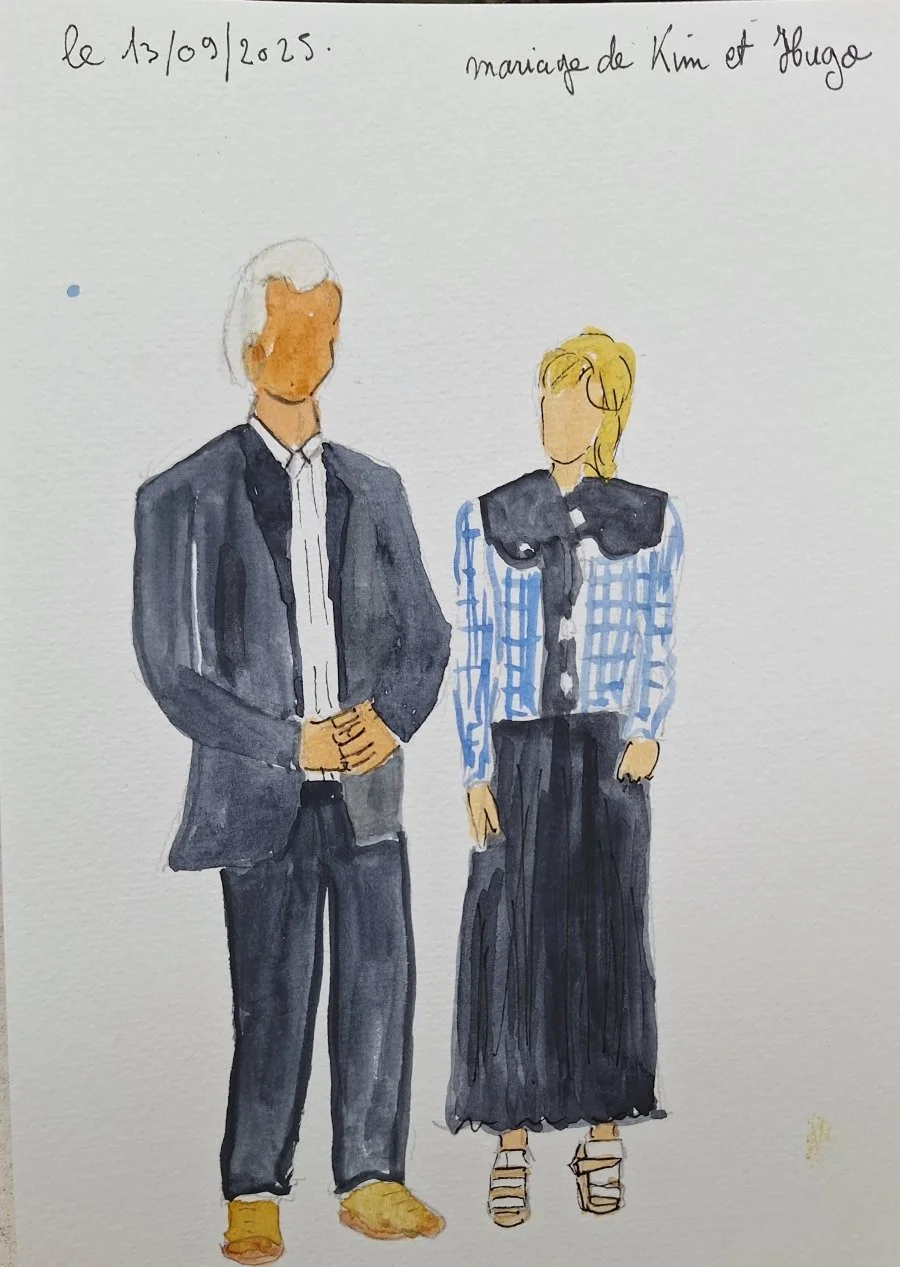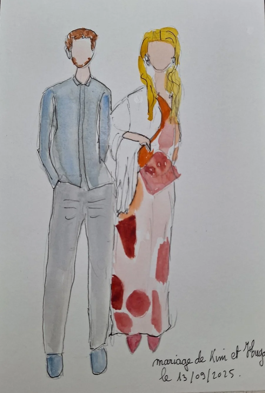 Offrez à vos invités un souvenir unique et poétique : un petit portrait croqué et aquarellé en direct.